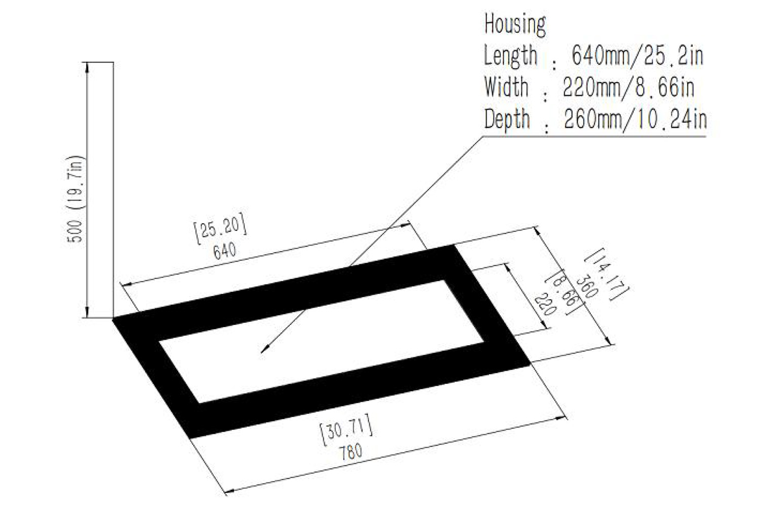 - Housing Size: 640mm (L) × 220mm (W) × 260mm (D) (25.2in × 8.66in × 10.24in)